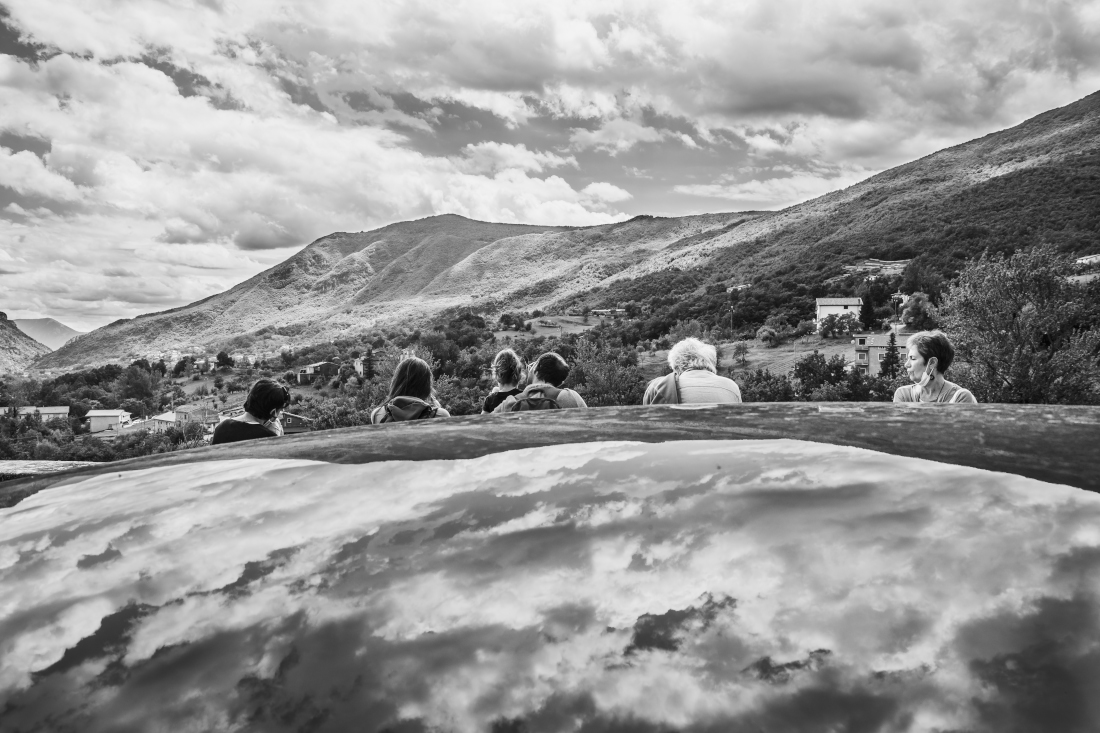 Mi piace un sacco l'idea di queste persone intrappolate tra impalpabili mondi di nuvole...come uno strappo su un cielo che nasconde una realta fatta di vita natura e montagne.Mascherine a riportarci all'attuale realtà anche in un momento di svago e relax. Non so se fosse possibile ma forse mi sarebbe piaciuto un leggero stacco tonale in più tra le persone e i vari piani delle terre intorno..