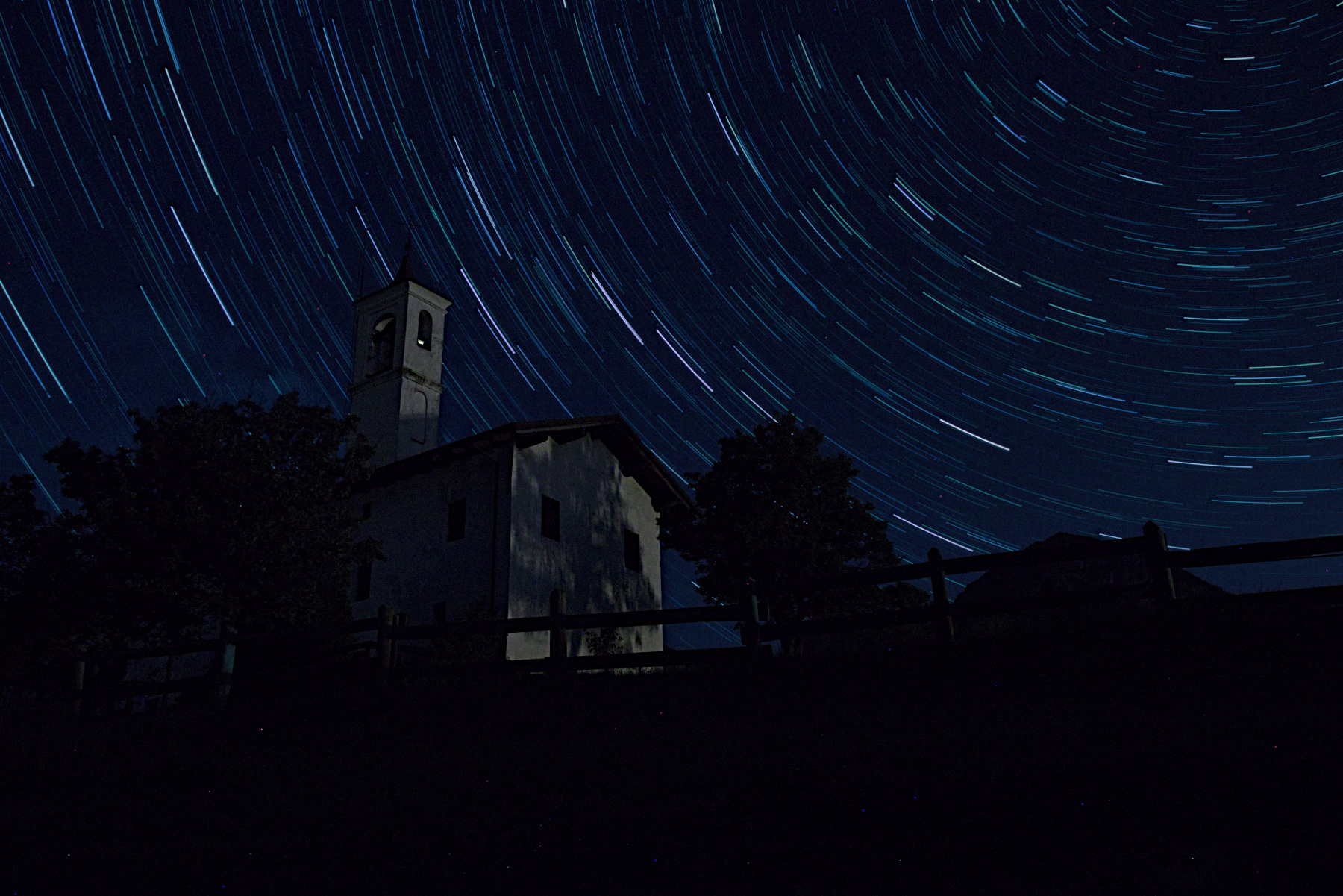 Interessante il grafismo dello startrail, ma la chiesa e il resto in basso e' troppo immerso nell'oscurità, Ci sono, sparsi per tutta la fotografia, puntini blu e rossi, che andrebbero rimossi, a mio parere.