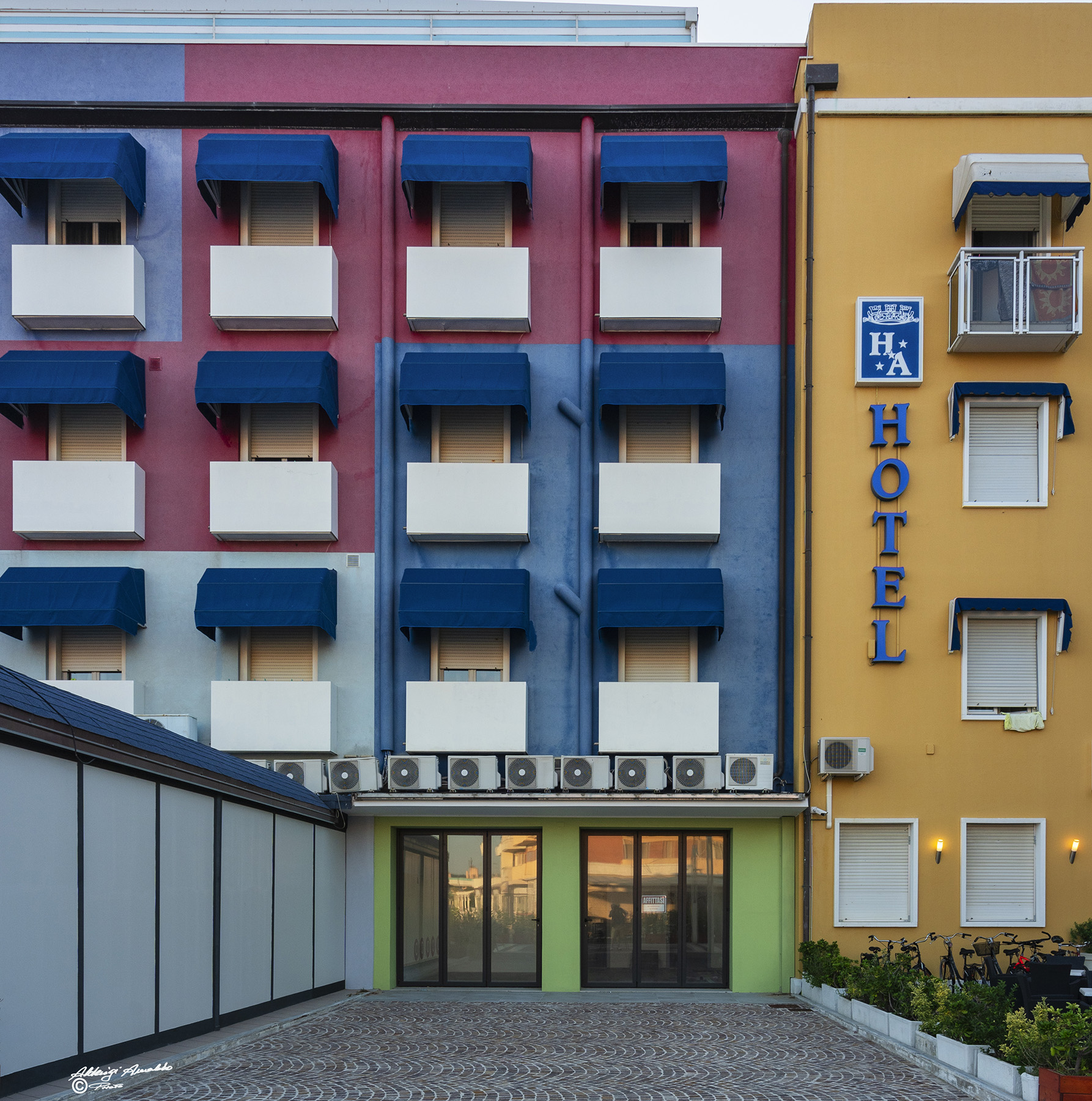 La facciata a destra distrae; a mio gusto. Al contrario, balconi e colori dell'albergo di sinistra li vedrei bene in taglio quadrato 3x3.