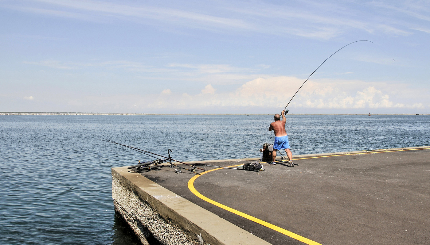 Ben colto il momento in cui il pescatore è in progressione al su lancio dove si vede anche il piombo sul filo.. Ben vista.