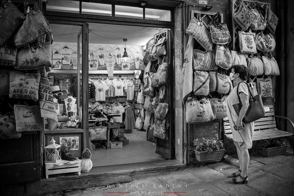 Scelta dura per la signora ma in questa foto trovo anche un richiamo tra tutte le tele delle borse esposte e la tela della mascherina della signora. Anche il suo viso e' messo "in una borsa" come quello di tutti noi di questi tempi.