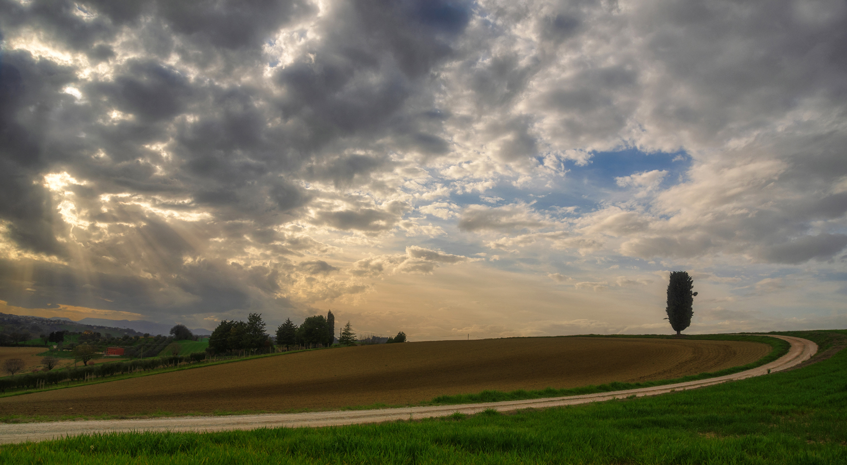 Che bella questa raggiera che spezza le nuvole,forte,elegante ma con discrezione,senza strafare...e mi piace il suo dialogare con l'albero, guardiano solitario di una piana dalle geometrie morbide e colorate. Efficace il sentiero che cattura lo sguardo e lo porta a scoprire il frame lungo una pennellata decisa. Mi piace l'atmosfera che si respira. Una bella proposta