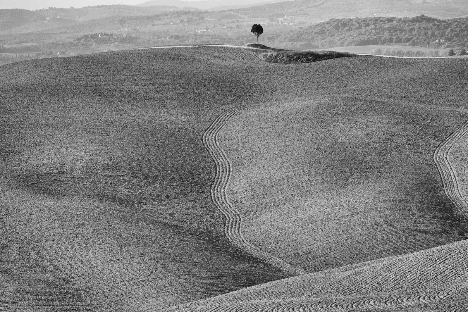 Mi piace molto l'eleganza di questo paesaggio in bn... c è la ricchezza di una fitta trama disegnata da sinuosi solchi, ma c'è anche la sobrietà di superfici pulite e morbide. L'albero spicca in maniera efficace, assumendo un ruolo da protagonista che lo sa esaltare senza sminuire il contesto,anzi valorizzandolo. Non so forse avrei provato anche a giocare con la composizione, provando vari tagli ,per decentrare l albero o non tagliare i solchi a dx. Ciao
