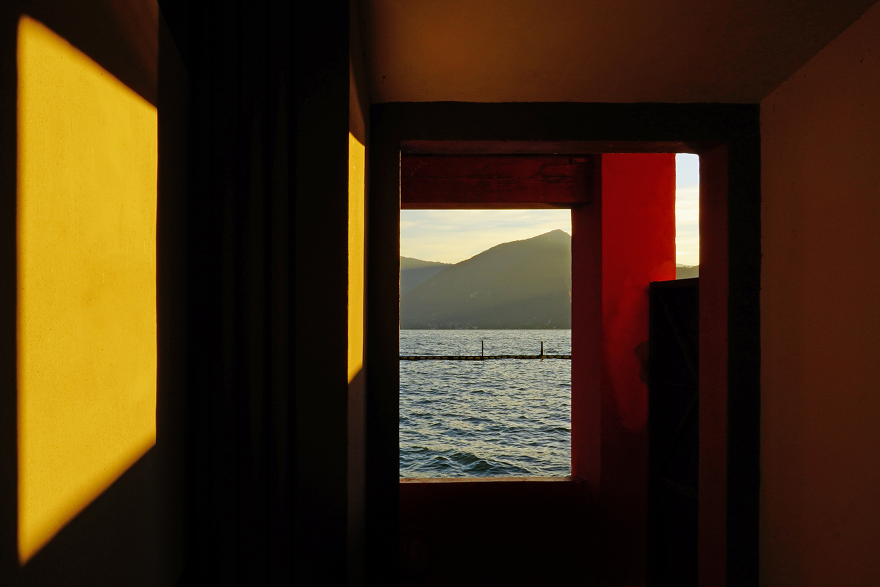 piace molto anche a me questa immagine un po' surreale con colori e forme che si alternano fino alla finestra aperta sul lago. Ottimo scatto