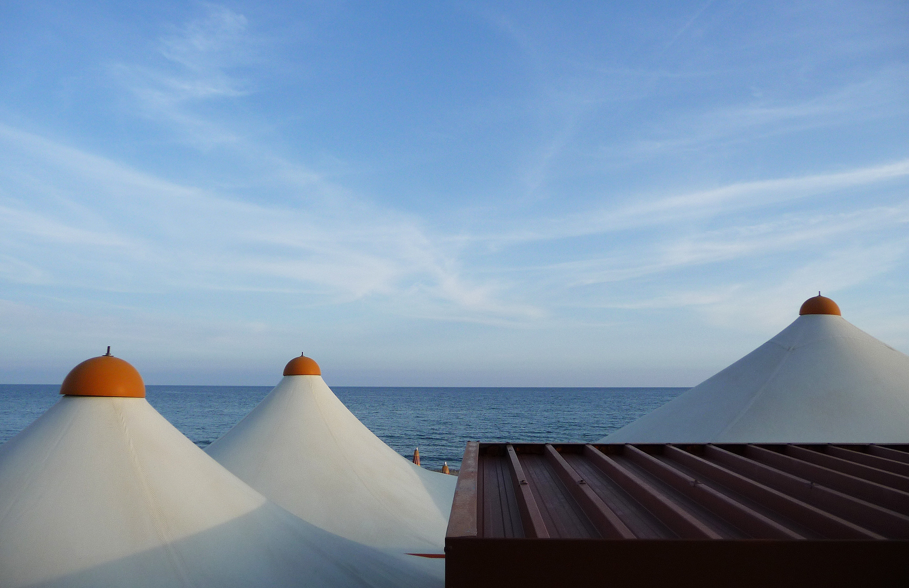 La preferisco per molti motivi, innanzi tutto la luce che valorizza le tinte, quel giallo spicca su tanto azzurro. Migliore la composizione decisamente più equilibrata e infine la non sovrapposizione perchè è una cosa complessa da gestire, si rischiano ''due soggetti'' che si rubano la scena e si rimane nel dubbio su cosa prevale alla vista. Diverso il discorso su questa tettoia che inevitabilmente c'è, l'unica alternativa possibile è un quadrato che racchiuda i due gazebi a sinistra e sarebbe un'altra foto scattata con un pdr diverso verso sinistra. Per fare buon peso attenta all'orizzonte che deve essere comunque dritto e di mio avrei clonato i due ombrelloni che sbucano al centro.
