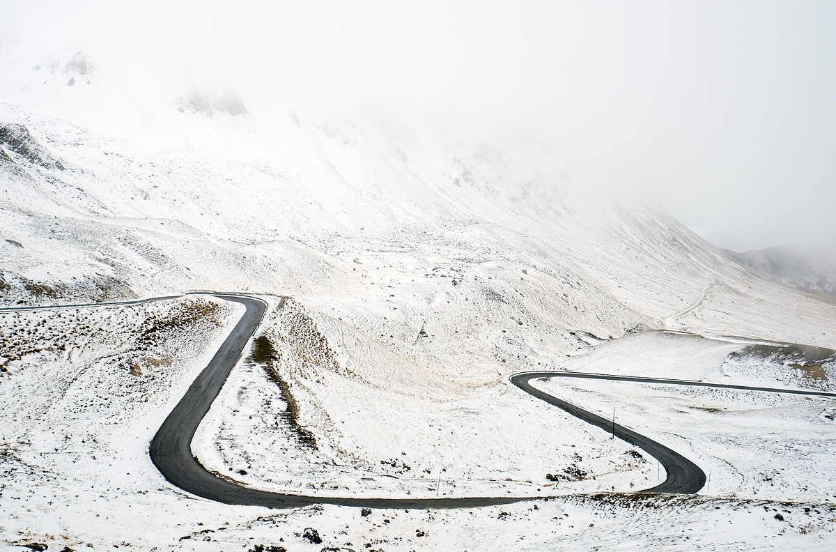 Anche più bella dell’altra… qui la strada ha maggiore rilevanza, e quelle curve sinuose e scure nel bianco totale del panorama sono molto belle… bravo!