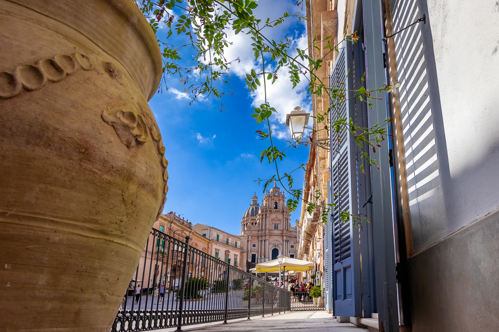 Ragusa Ibla il Duomo di San Giorgio, visto tra una grande giara di pirandelliana memoria e il Circolo di conversazione