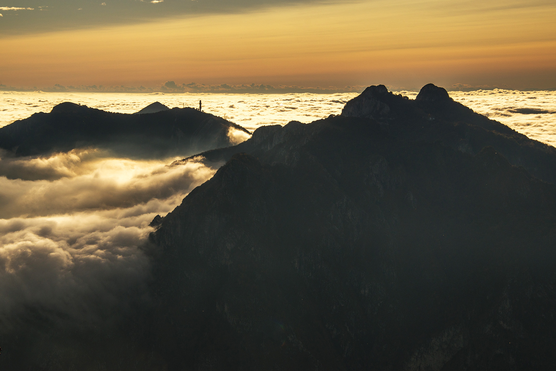 Splendida situazione ambientale con nubi medio basse sulla pianura e sopra il sole dorato, probabilmente mattutino, che scalda le alture. Ottima ripresa! Ciao, Francesco _________________ Fotocamere Olympus OMD e PEN, Panasonic G3. Software GIMP