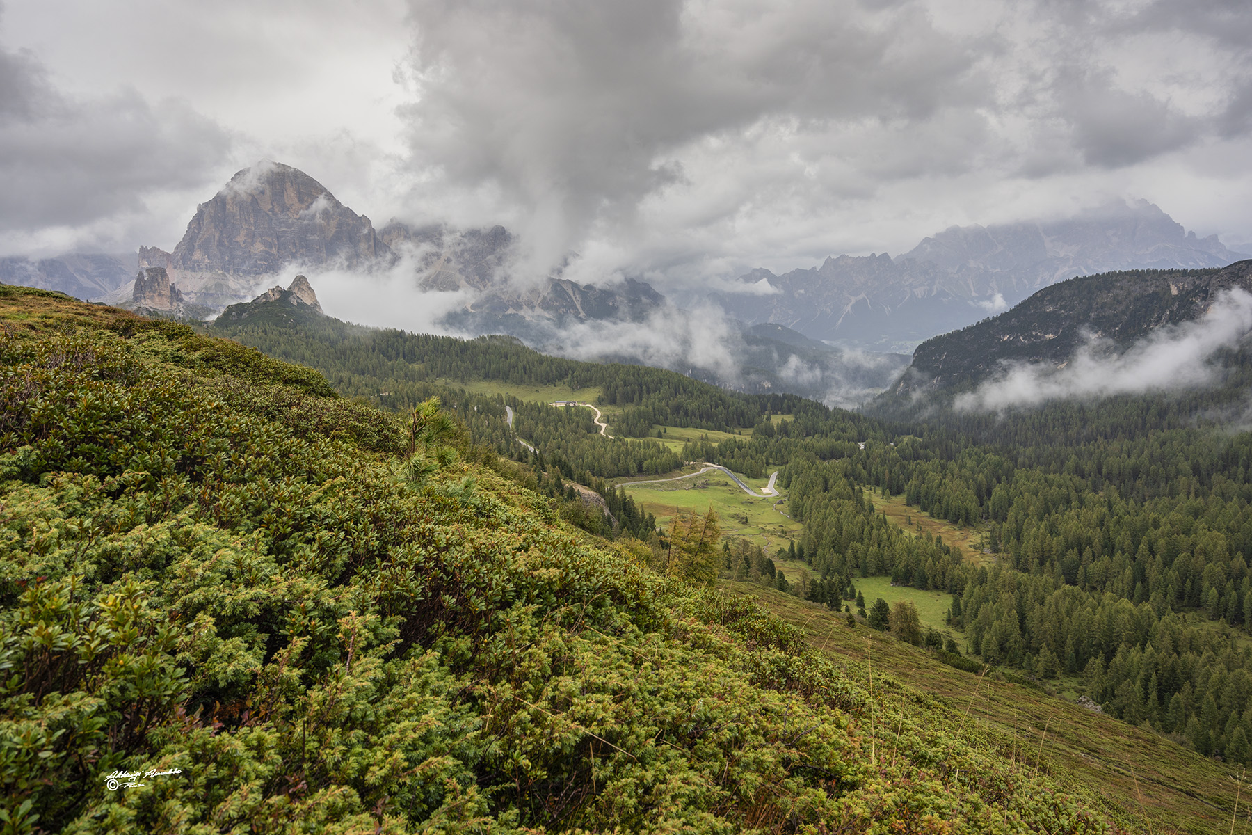 Molto bella… Mi piace il grigio cupo del cielo che si contrappone al verde intenso della valle; belle le montagne inframmezzate dalle nuvole e suggestiva la strada che si dipana verso valle. Bravo!