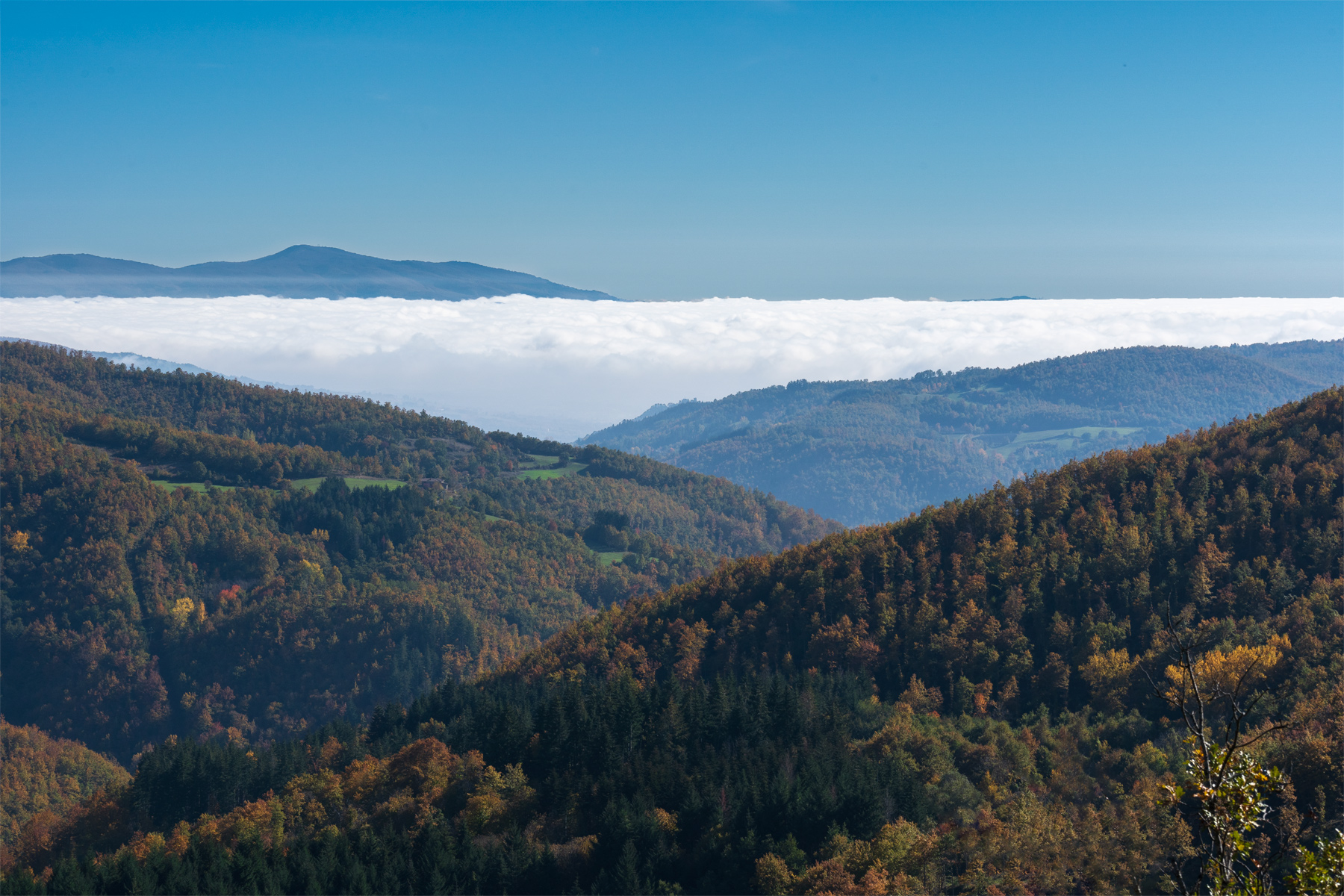 Molto bella la parte ovattata nelle lontane montagne, molto piacevole anche la boscaglia colorata dove ha tratti emergono dei bei prati verdi.. Ben vista.