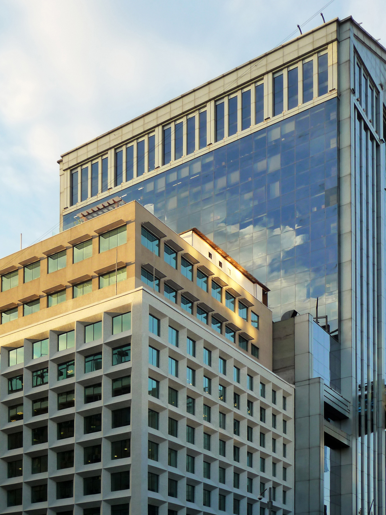 Il palazzo in primo piano appare leggero; belli i riflessi sul secondo, grazie alle finestre sembra avere un effetto "pixel"