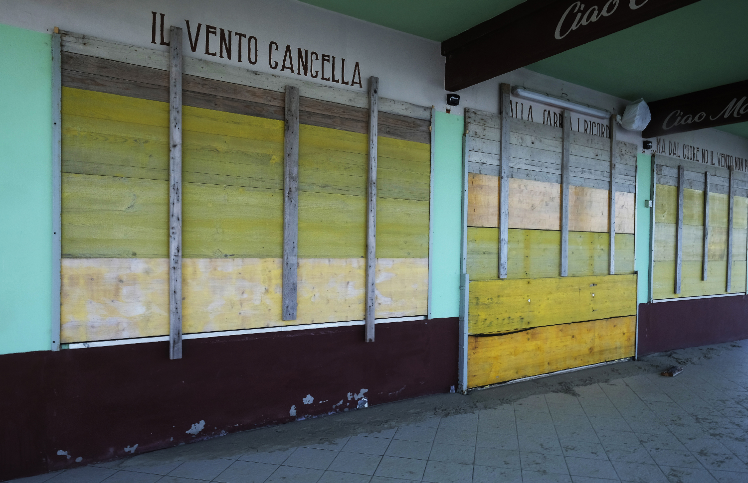 Un’immagine tristemente attuale, come il titolo ci ricorda, in contrasto con l’allegria della canzone citata… Belli i colori, anch’essi a contrasto del grigiore del momento e del luogo.