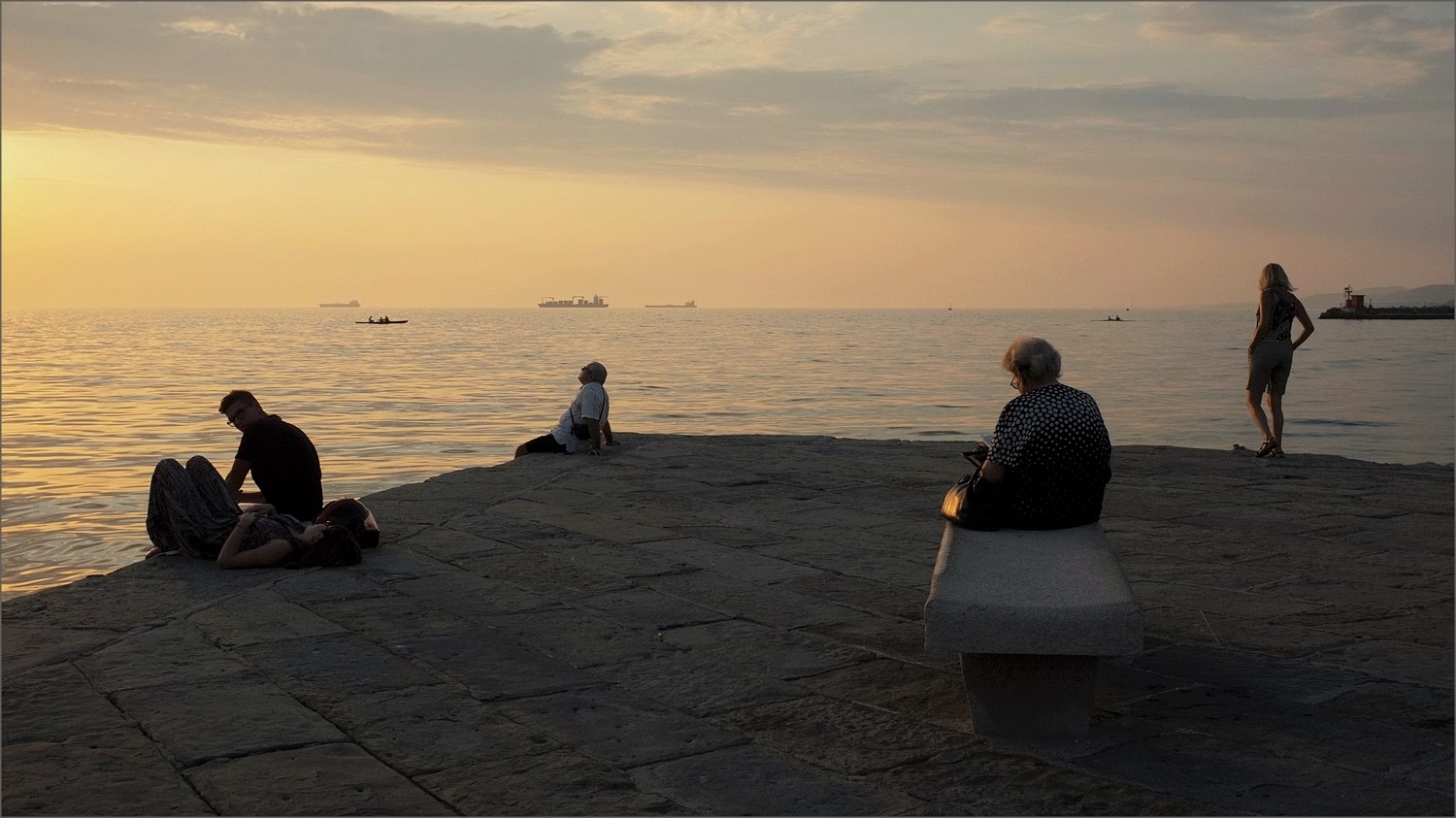 ognuno guarda in direzioni diverse, la ragazza il mare la signora sulla panchina il suo libro, l'uomo seduto il cielo ed il ragazzo la sua compagna.