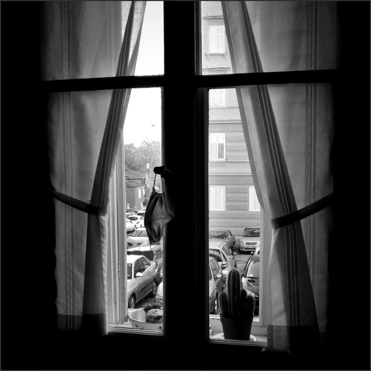 Eh sì, ci sono tutti gli elementi… ripresa da un interno, finestra chiusa, mascherina appesa, assenza di persone in strada… Immagine tristemente attuale… non so se è peggio estenuarsi o abituarsi…
