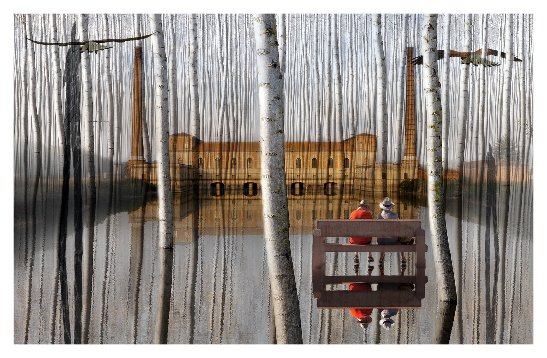 Che bellezza. Quei tronchi diventano quasi pieghe di un tessuto su cui è stato stampato lo sfondo. La panchina col riflesso è fantastica e trascende la realtà per divenire visione. Ottima lavorazione d'insieme per un'immagine fantasiosa e onirica. Bravo  _________________ - Fotografo della domenica |