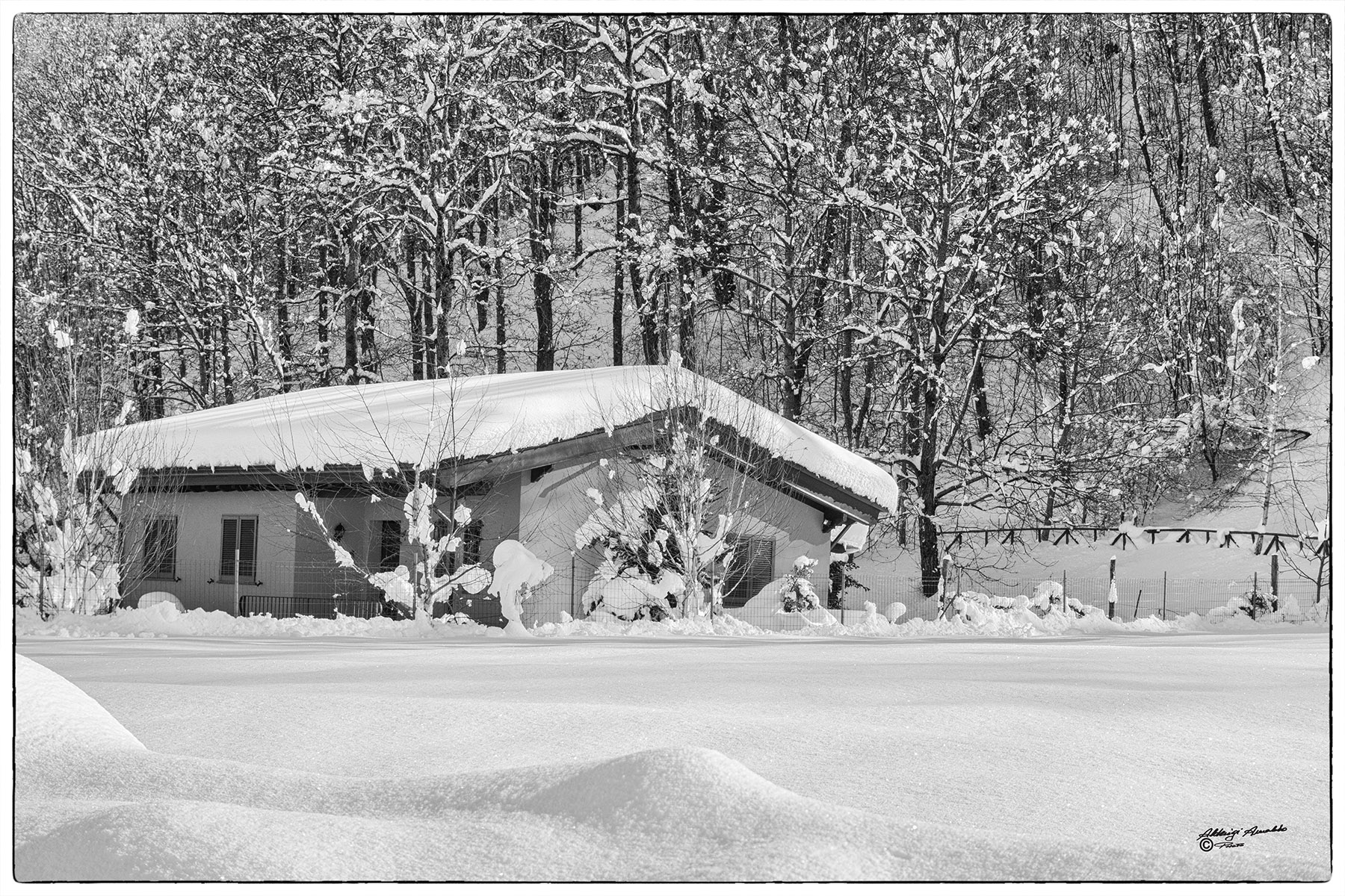 Ottima Arnaldo… Bella la contrapposizione tra la neve sugli alberi, che forma quasi un ricamo, e quella sul tetto e a terra così liscia e perfetta. Impeccabile il bn.