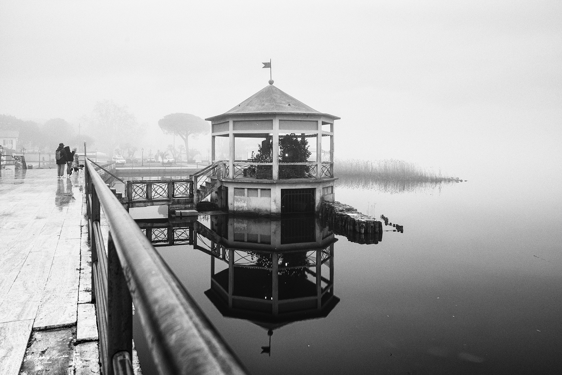 Bella immagine in b/n, piacevole il gazebo riflesso nell'acqua con la nebbia sullo sfondo.