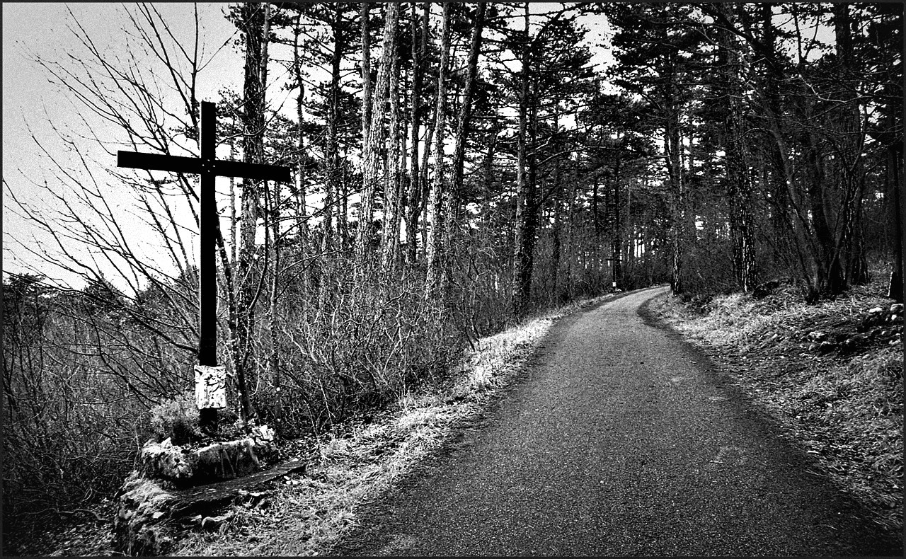 Non conosco il sentiero né il significato che l’accompagna, ma trovo la foto ugualmente coinvolgente… Pellicola e bn la rendono senza tempo, suggestiva.