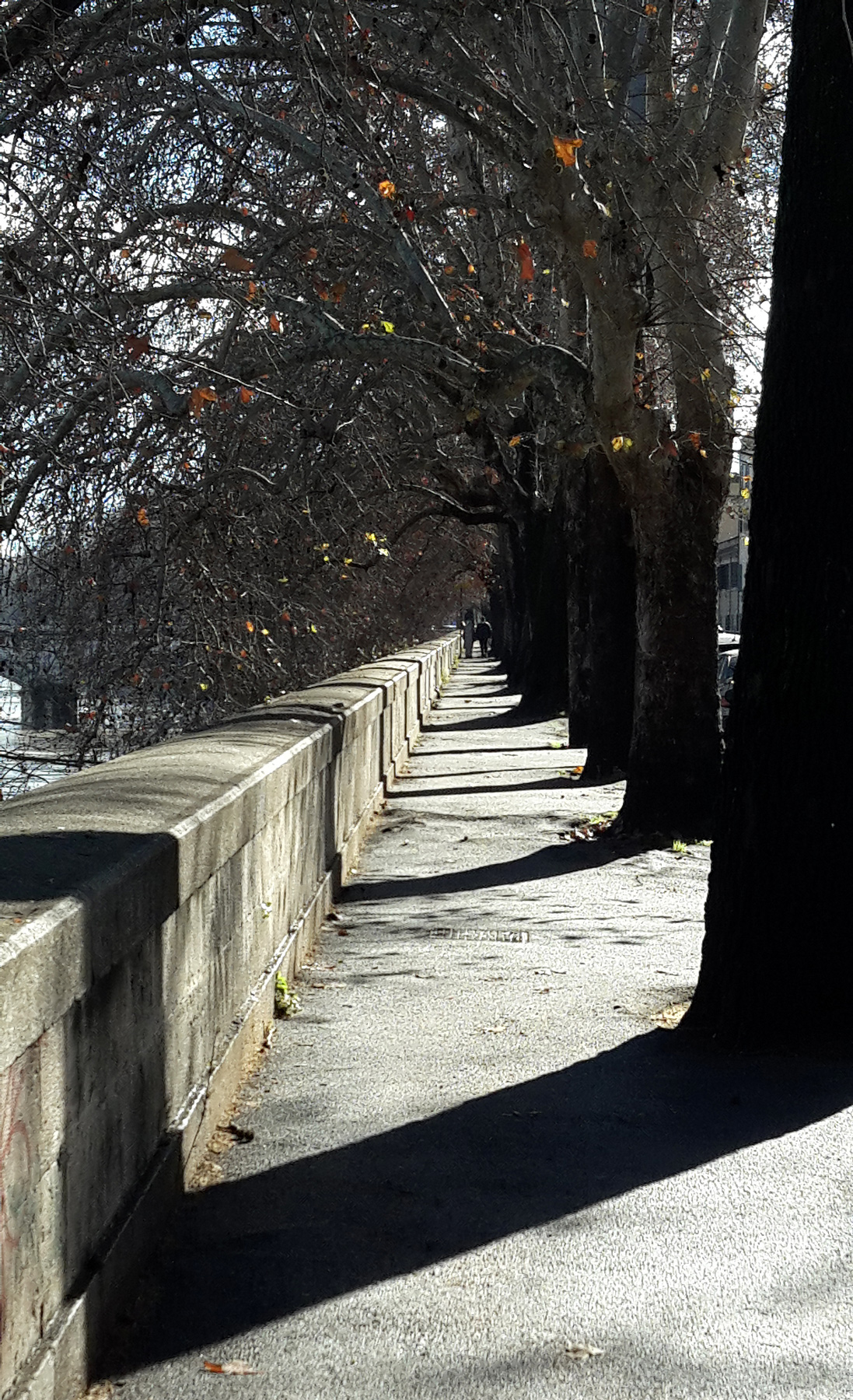 Bella questa infilzata di platani che si riflettono formando delle ottime linee d'ombra fino ha scavalcare il lungo muro che costeggia il fiume.. ottima composizione mi piace. Ciao