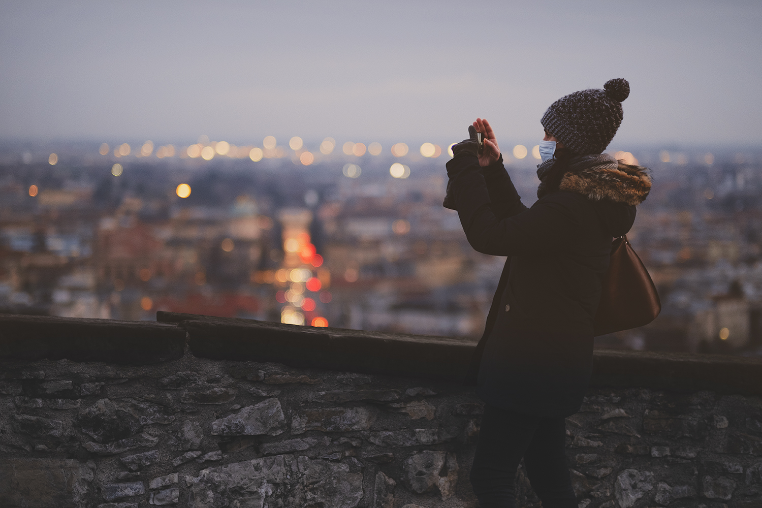 Molto bello il contrasto di maf tra la ragazza e lo sfondo (avrei però scurito la mascherina che si perde un po’ sul cielo e aumentato la nitidezza del primo piano…). Particolarmente belle le luci della città, che formano come delle palline luminose