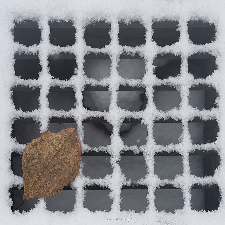 Una griglia disegnata dalla neve.. e la foglia che arricchisce l'immagine. Ben vista.