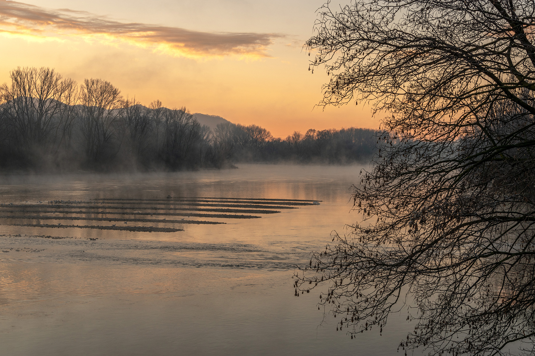 colori pastello in cielo, colori freddi si muovono nella discesa del fiume..molto bello l'albero in primo piano..  |