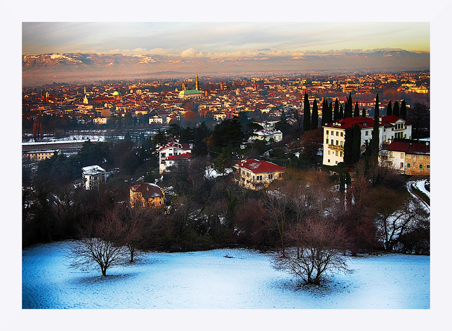 Grande profondità che dalla collina innevata ci conduce alle lontane montagne attraverso la piana puntellata dalle case di Vicenza sempre più fitte verso il centro storico individuato dallo svettare dell'alto campanile.Bellissimi i colori ed il susseguirsi dei piani,ottimo punto di ripresa.Un magnifico tramonto di un bruttissimo anno! _________________ Sergio Demitri https://www.flickr.com/photos/124946035@N02/ |