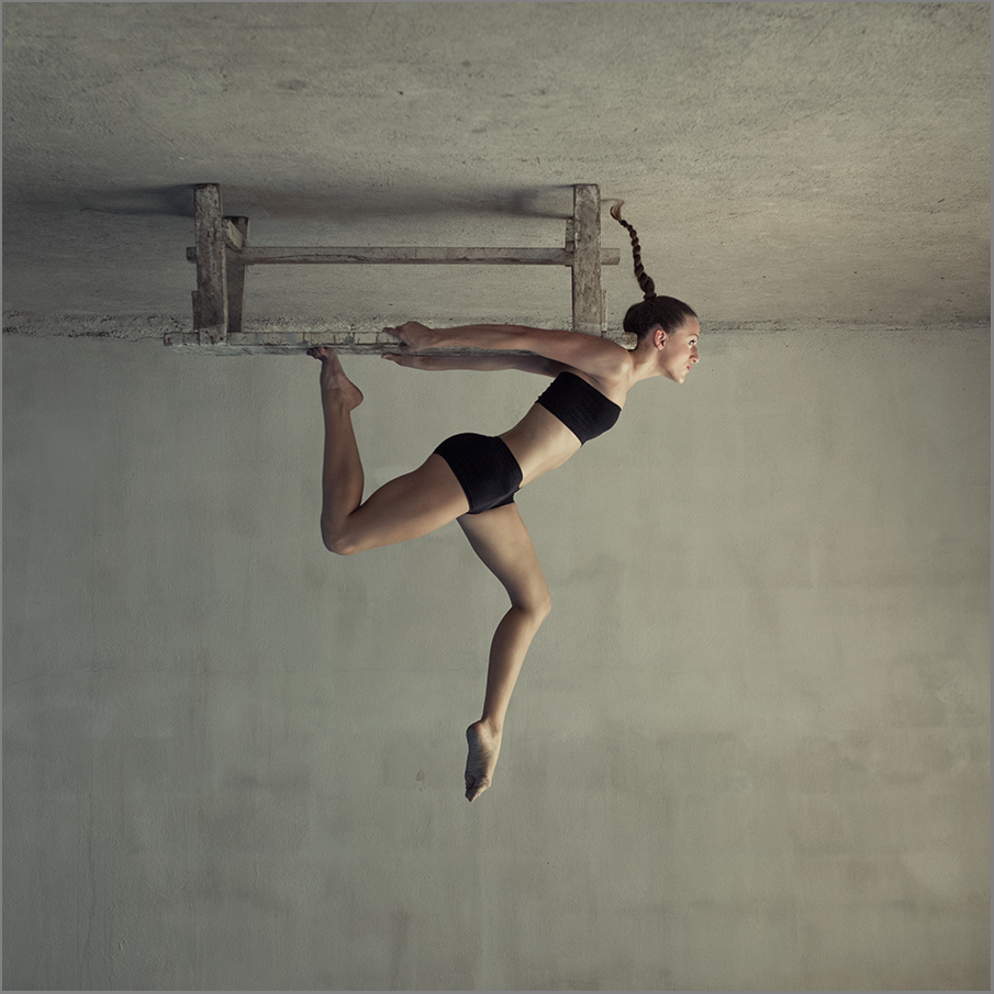 Ammirevole per scelta compositiva e ribaltamento del punto di vista obbligato. Il gioco visivo è perfettamente coerente dato il gesto aggrappato della modella alla pensilina appesa al "soffitto".