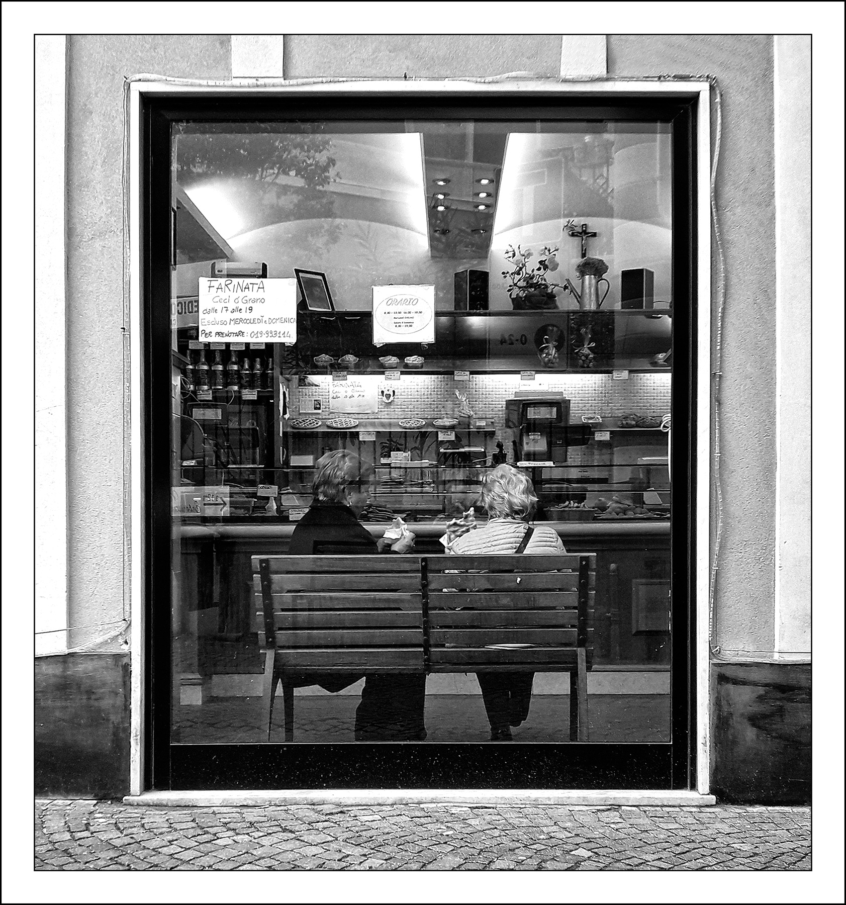 Street golosa questa Bruno! In termini strettamente fotografici il rettangolo nel rettangolo una preziosità e la gestione della luce tra interno ed esterno non facile ,ma non certo per te . Il bel bn esalta la 'sacralità' della pausa.