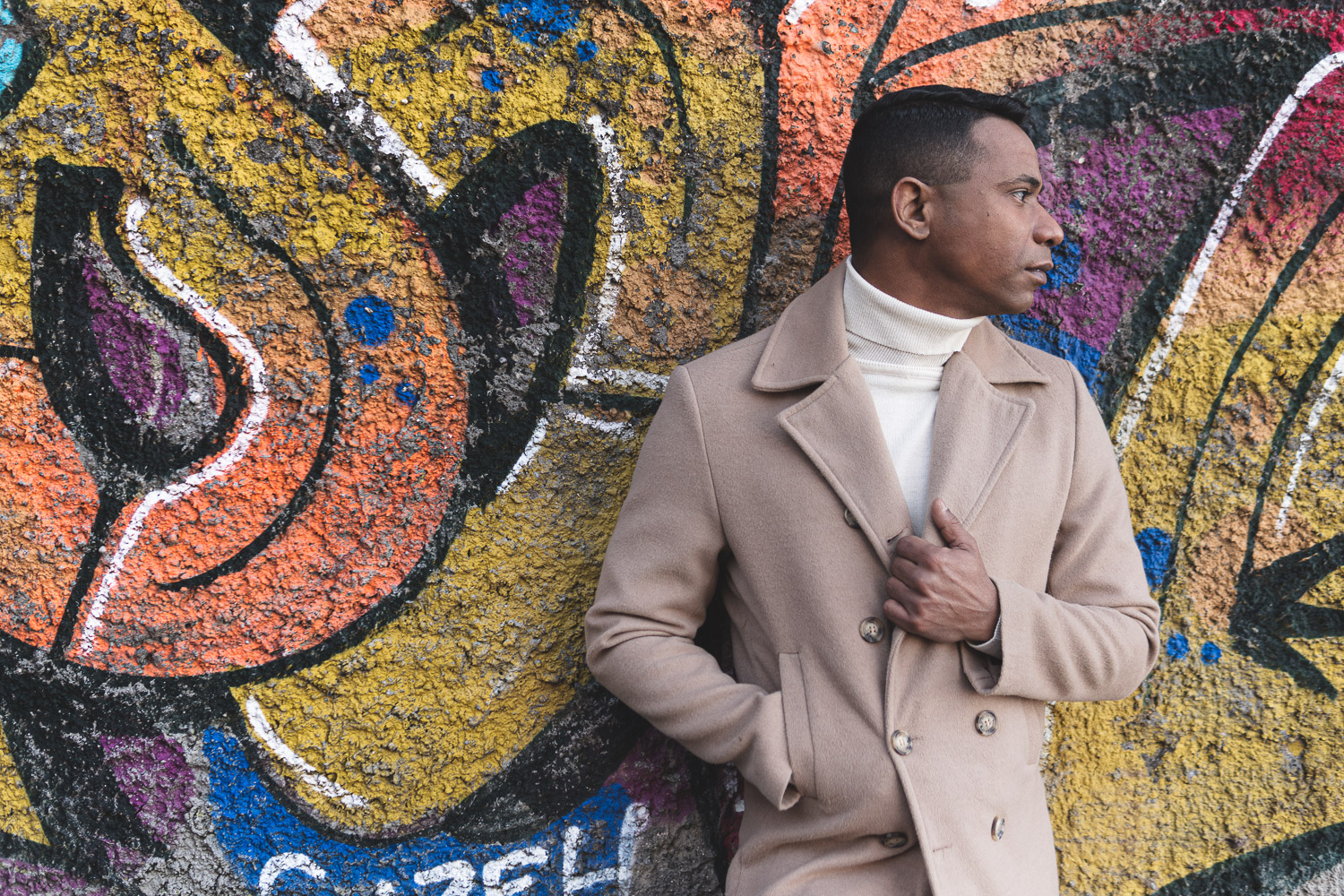 I colori del murales danno energia e ritmo, ci proiettano dentro un mondo di strada, urban, street art, il modello invece è l'opposto, ben vestito, in un cappotto classico e maglia a collo lungo e posa napoleonica, del tutto distaccato e lontano dal mood retrostante.