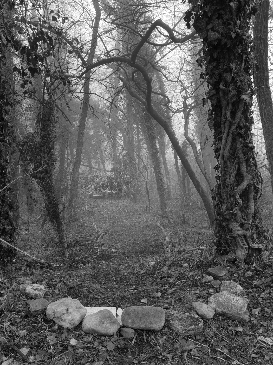 | Dei sassi a delimitare il terreno,sullo sfondo dei tronchi recisi disposti circolarmente, con rami scheletrici che sovrastano il tutto.......un ambiente per rituale che i toni del bn e la nebbia non densa fanno presagire come soft . Mi piace molto |