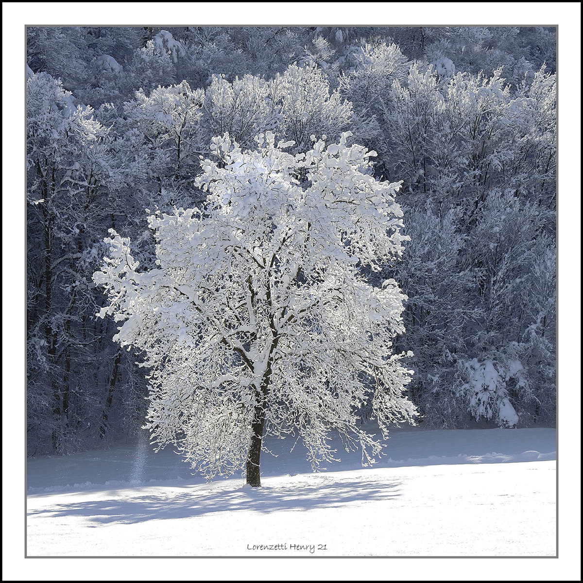 Un prezioso ricamo questo splendido albero ricoperto di ghiaccio… Essenziale e molto bella la composizione e fantastici i piani tonali tra il solista, con la sua ombra, e il bosco sul fondo. Bellissima, complimenti.