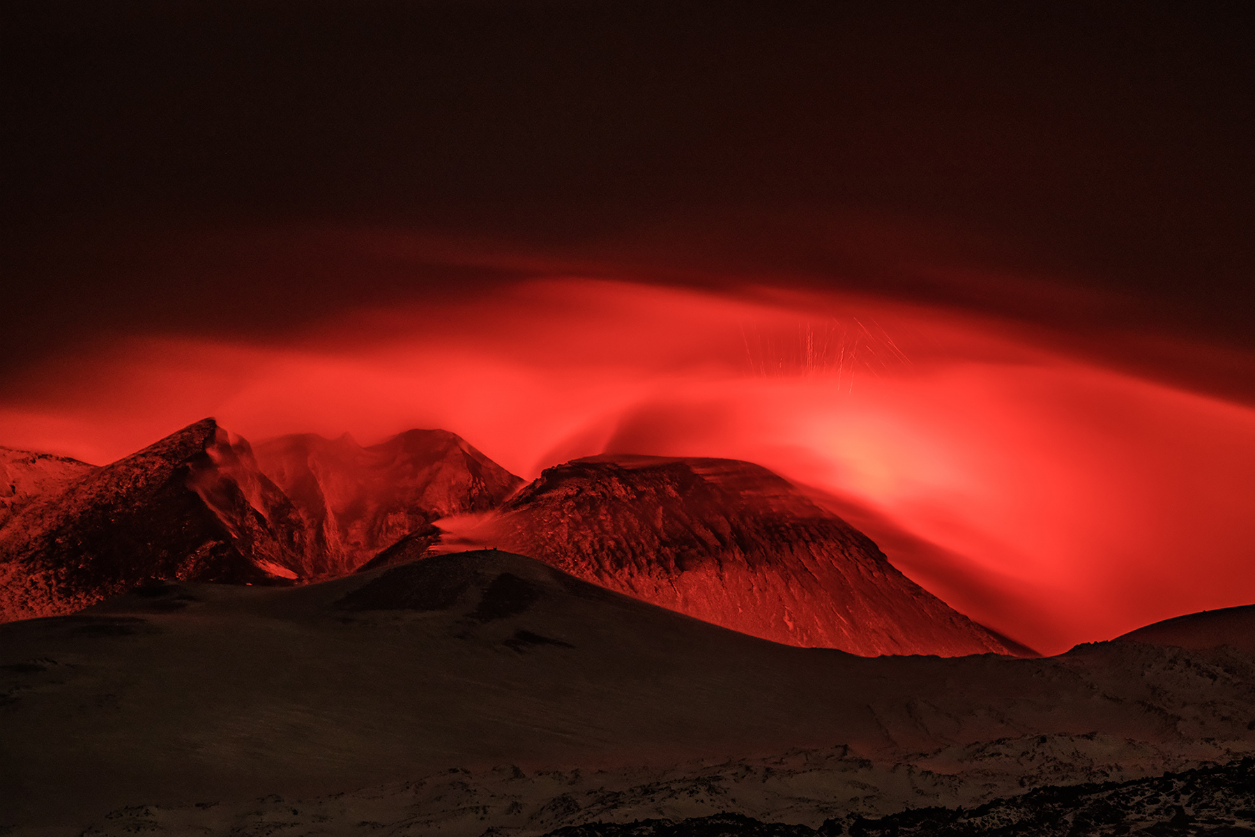 Lo scatto è del sette gennaio e quella sera una coltre di fitte nubi ha fatto da tappo agli spruzzi di lava creando una magica atmosfera Dantesca.