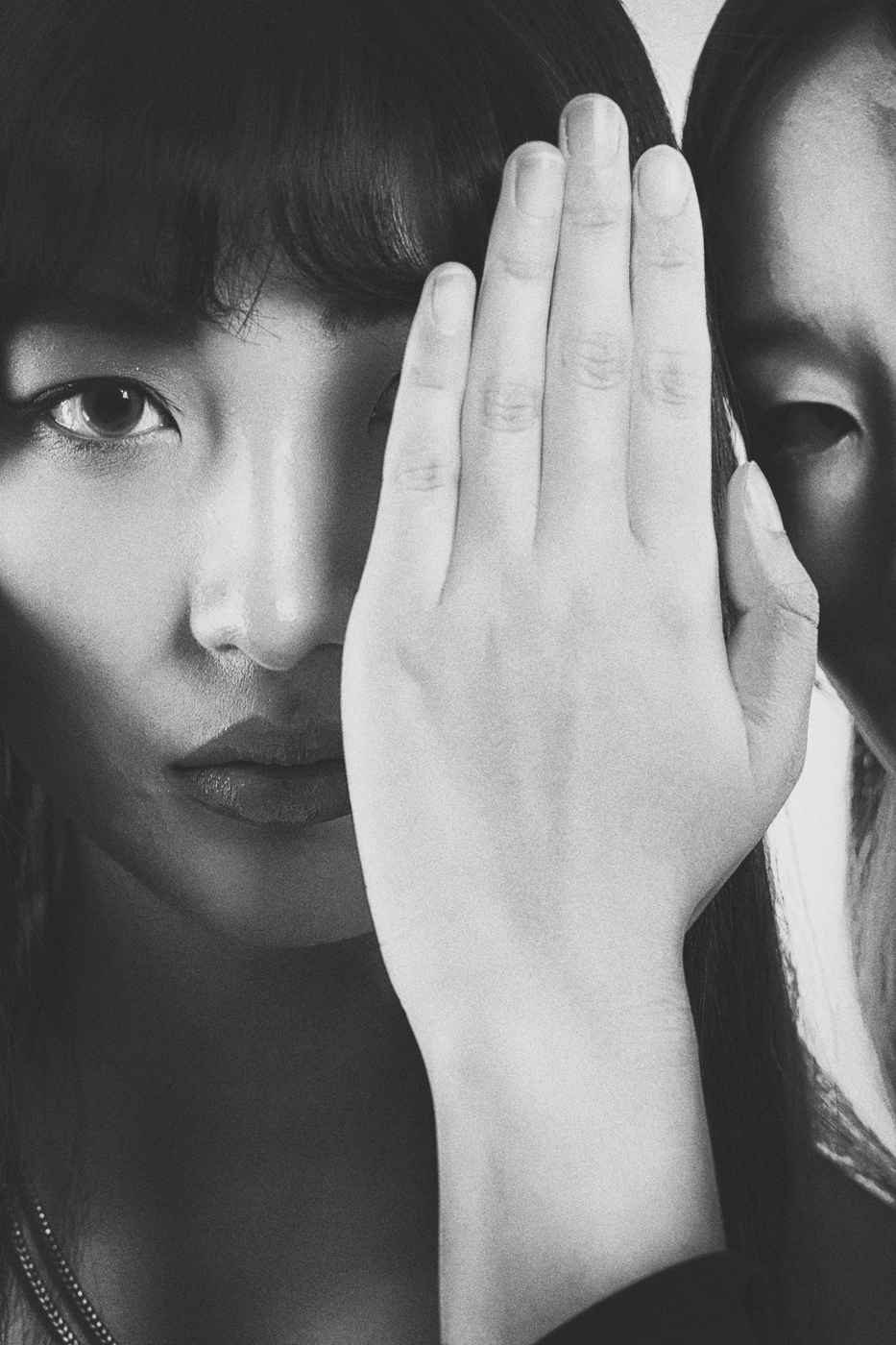 Gli occhi delle due ragazze sono equamente marginalizzati e costituiscono gli estremi di un unicum in cui la mano è il soggetto che regge tutta la costruzione, fungendo da finto schermo.