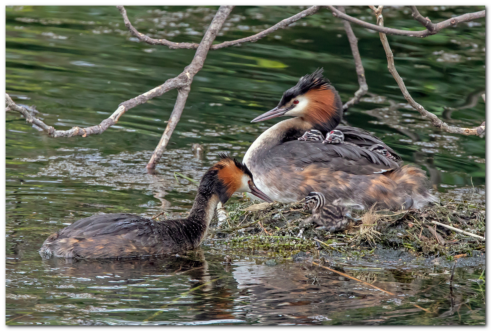 PS: da specificare che il nido, una volta schiuse le uova, serve solo come punto di riposo. La particolarità degli uccelli acquatici, dal cigno al tuffetto, è che i piccoli una volta usciti dall'uovo svolgono la loro vita sull'acqua, solo la sera ritornano nel nido per il riposo.... anzi non tutti! Gli smerghi ad esempio una volta abbandonato il nido sulle rocce o nel bosco non vi ritornano più.