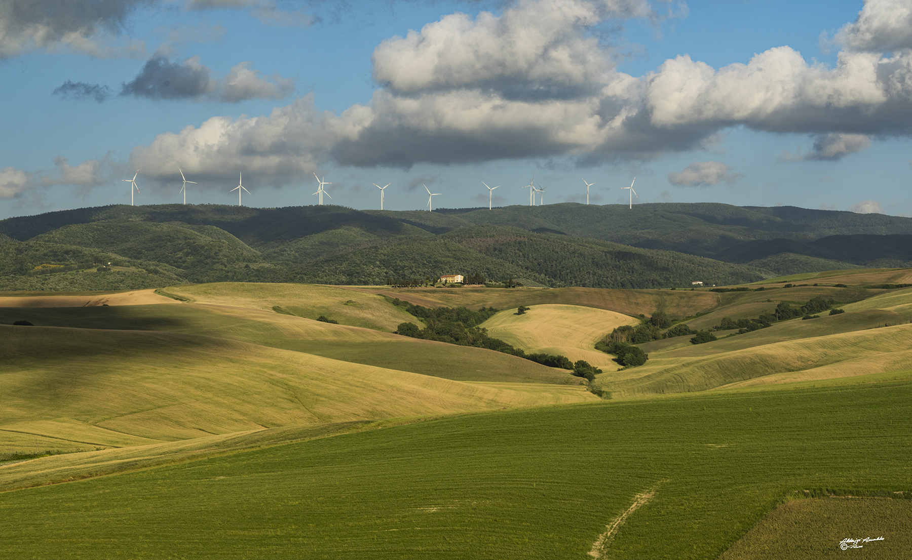 una bella immagine primaverile, prati verdi e cielo azzurro punteggiato da nuvoloni bianchi, le eleganti pale eoliche (sono di parte, mia figlia lavora nel settore ) completano il bel quadro. Mi piace molto