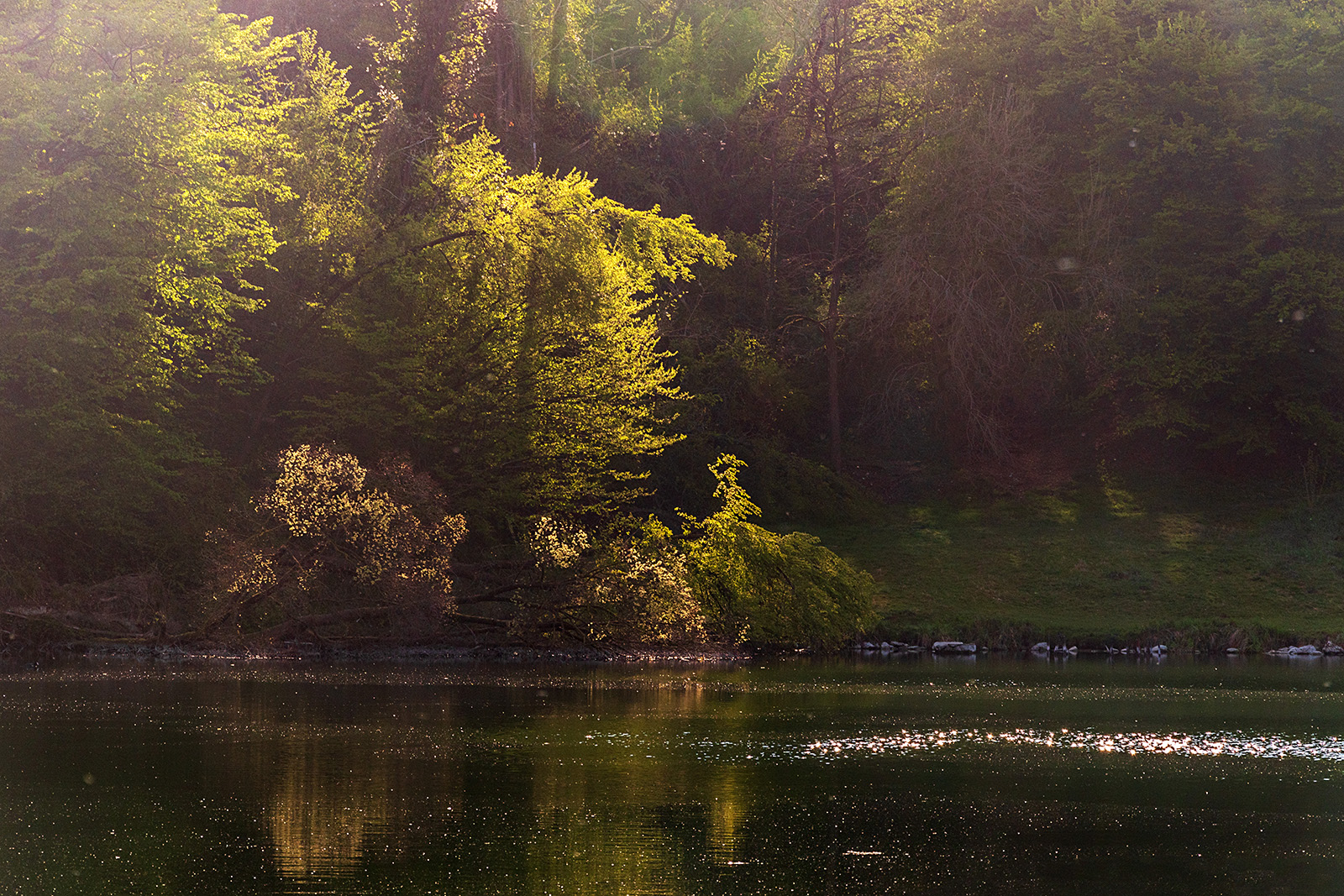 Bellissima questa filtrazione di luce, che illumina e dipinge alberi e l'acqua. Ben vista.