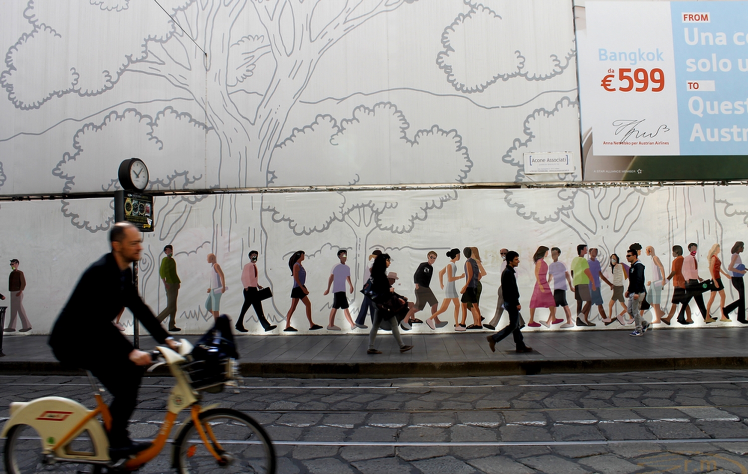 Una folla virtuale; la scena è interessante, forse il ciclista è superfluo.