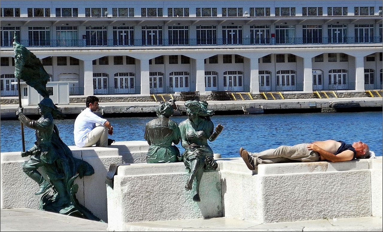 Bello l'accostamento tra statue ed il signore sdraiato a prendere il 1°sole.. ben osservato.. ottima composizione. Ben vista.