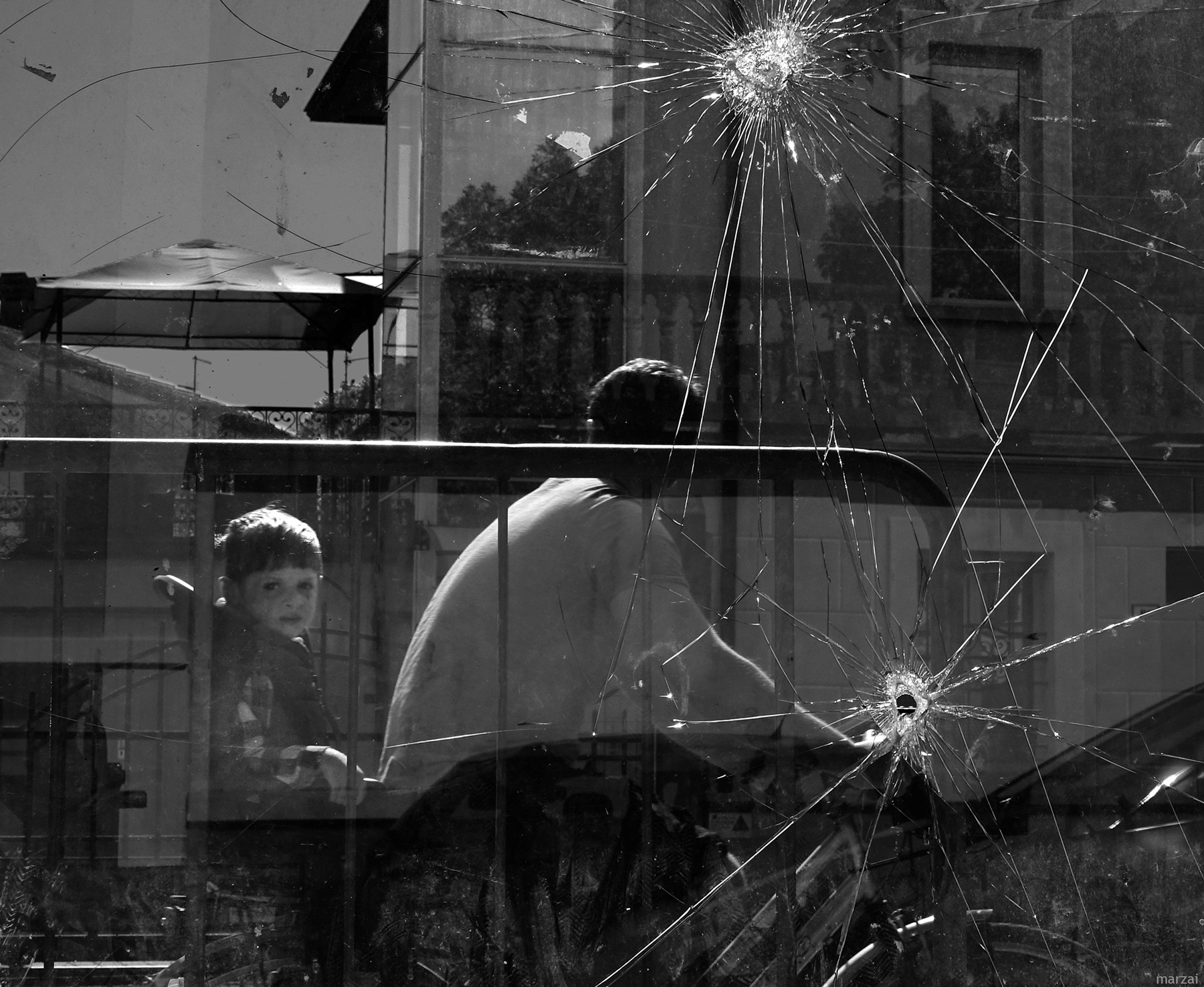 Immagine molto particolare… un contrasto violento tra la brutalità della vetrata crivellata di colpi e la serenità di padre e figlio che passeggiano in bicicletta e che in essa si specchiano… Un’associazione davvero molto avvincente, in fondo un simbolo di quest’epoca così contraddittoria…