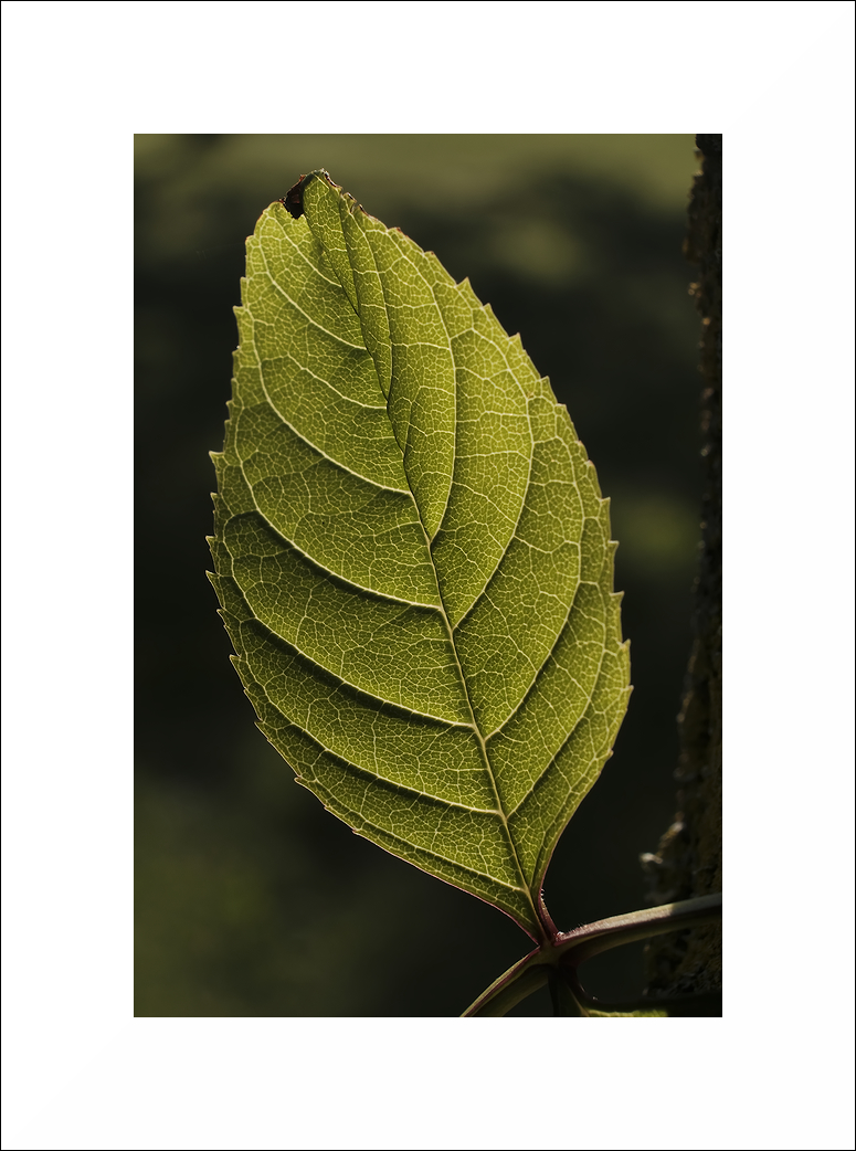 Condivido il plauso per questo scatto molto ben eseguito. Splendida la luce che accarezza la foglia mettendone il risalto le nervature. A mio gusto forse un po' troppo ampia la cornice bianca. Ciao 🤗