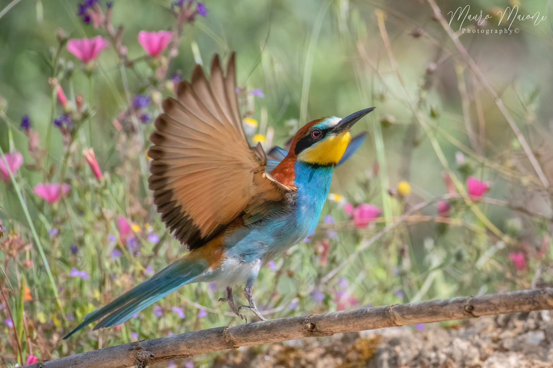 Ancora più spettacolare il dono che ti ha fatto questo gruccione aprendo le ali abbracciando il tuo scatto. Che meraviglia vederlo sulla punta delle zampine come in un balletto.