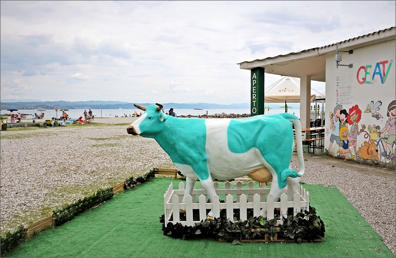Mucca marittima che forse si sente un po' spaesata a due passi dalla striscia di mare li a due passi.