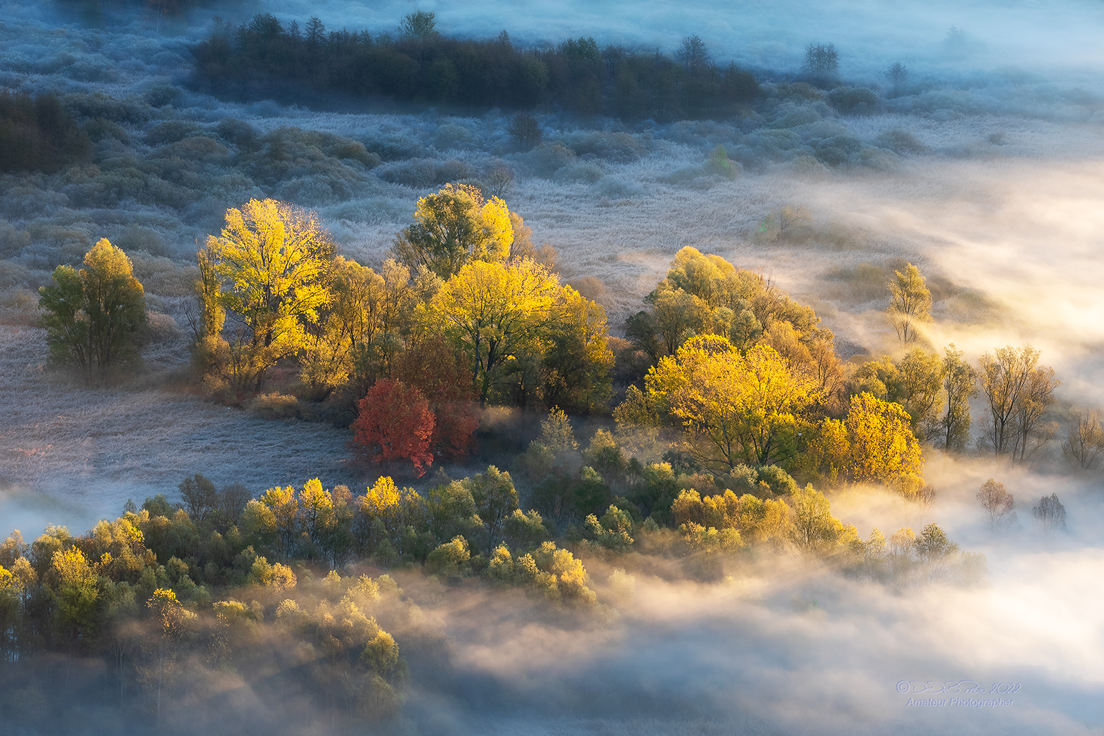 Bellissima la luce calda che investe gli alberi in contrasto con i toni freddi, la nebbia poi rende un'atmosfera magica.