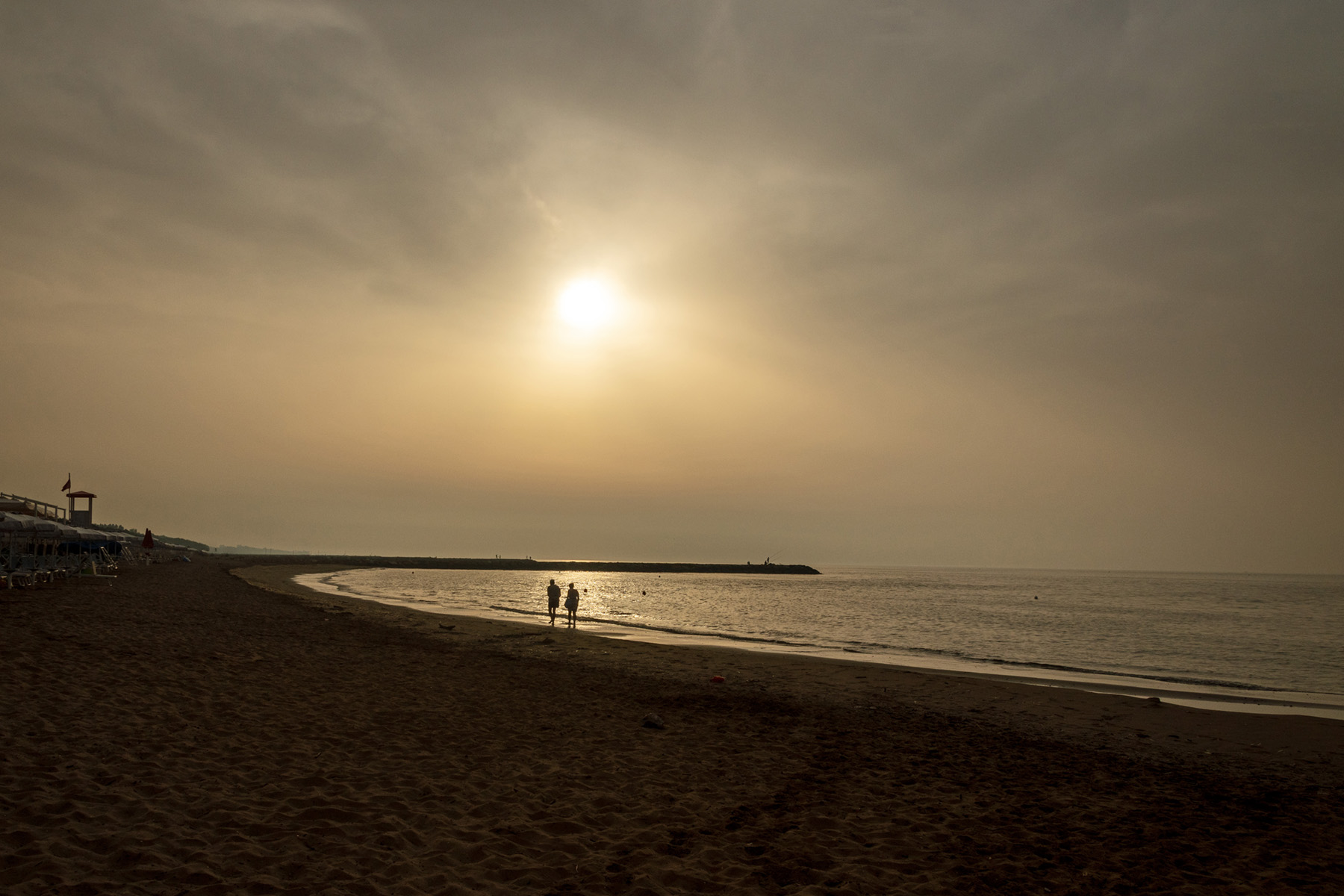 Un bene aver trovato il cielo velato, non distoglie l'attenzione dalla coppia che passeggia sulla spiaggia.