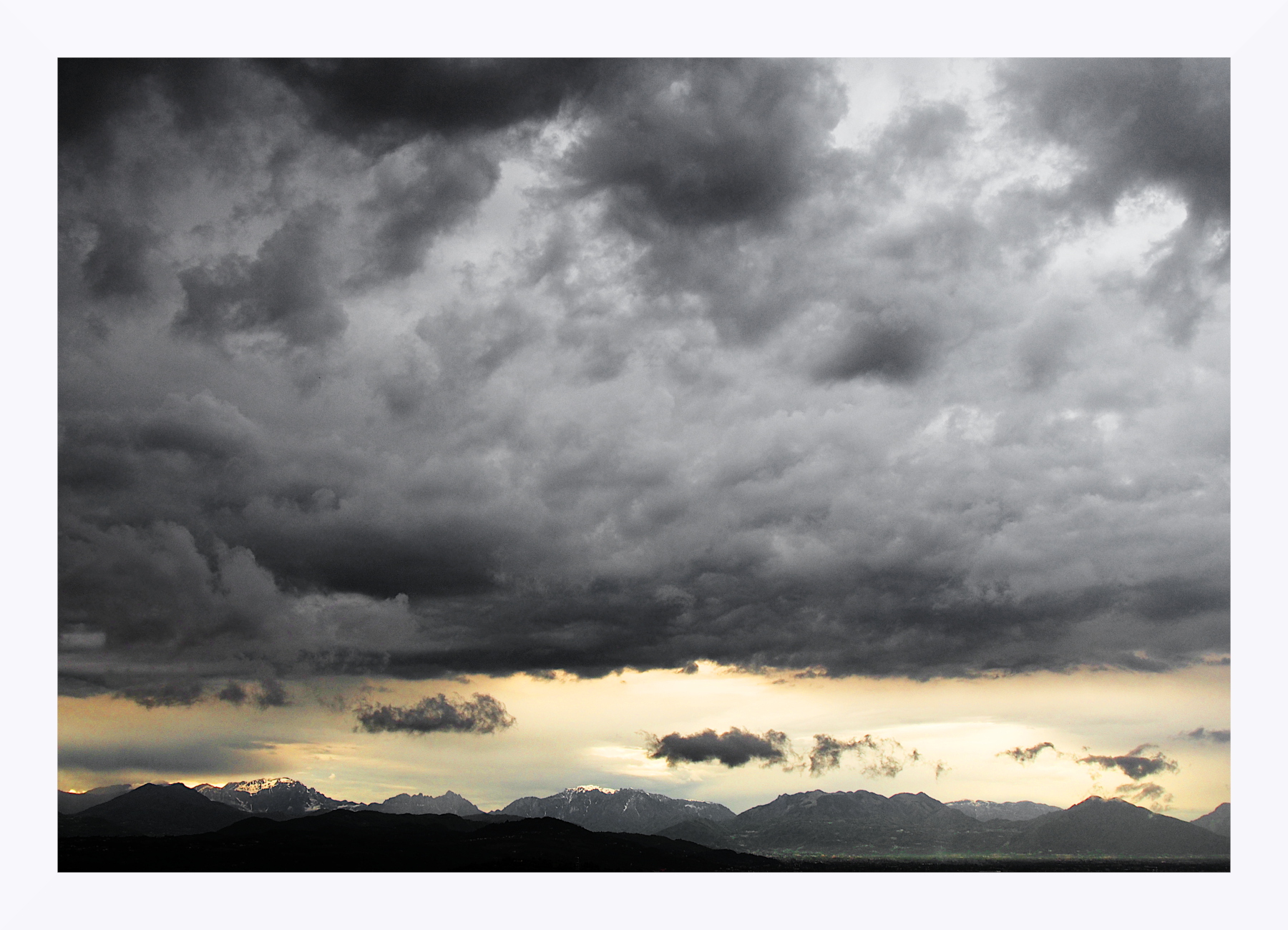 Mi piace molto la scelta di includere una minima parte delle vette per lasciare spazio al vero protagonista:un cielo minaccoso che hai reso ottimamente! Ciao