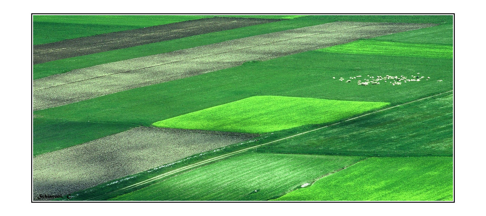 | Sembra che qualcuno si sia divertito a tappezzare i terreni con toppe di vari toni di verde creando un abito di Stenterello Green dove sembra che si sia piacevolmente adagiato uno stormo di gazzette. Mi piace assai . Ciao, Tiziano |