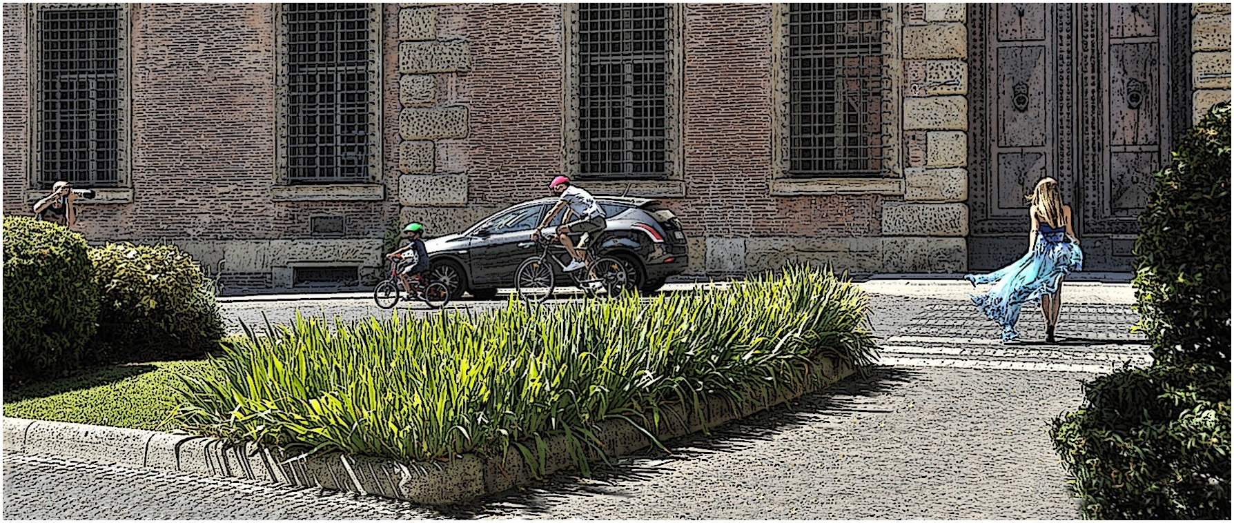 Interessante elaborazione.Il formato panoramico si estende sulla sinistra a catturare il cacciatore in agguato della bella preda dalla gonna svolazzante sollevata da un vento che sembra sospingere i due ciclisti padroni della zona centrale e perfettamente inseriti nella sagoma cuneiforme dell'auto.Bello scatto. Ciao,Sergio. _________________ Sergio Demitri https://www.flickr.com/photos/124946035@N02/ |