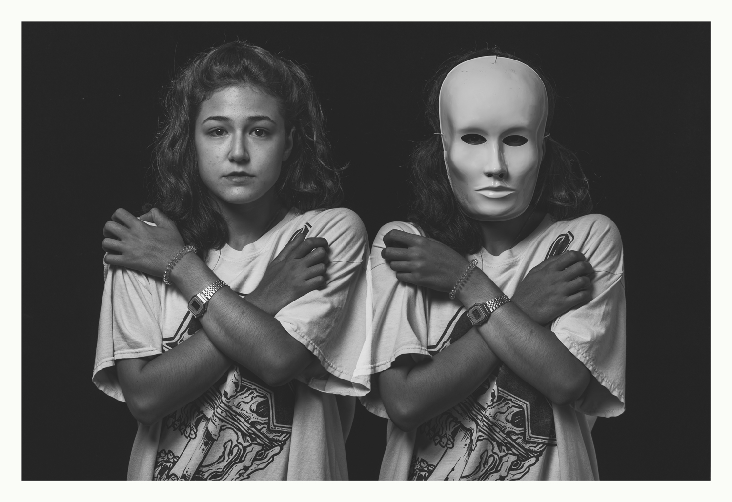 Intensa e spiazzante... Un carico di significati che si può leggere nel linguaggio del corpo, nei simboli,come la maschera, nell' espressione... Un abbraccio o un tentativo di chiusura e protezione.La voglia di manifestare con orgoglio la prooria identità o il bisogno, l'arrendevolezza nel volersi nascondersi dietro una maschera, non scelta ,ma affibiata, da chi per comodità non vuole vedere... Uniformarsi ad una realtà dentro cui non ci si sente qualcuno, ma uno dei tanti... E così la prima lotta è con se stessi e con la doppia personalità con cui si viene a convivere.