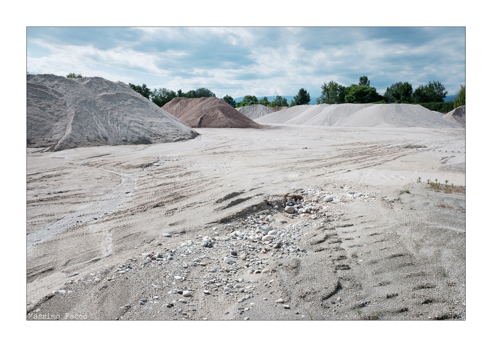 Mi piace questo paesaggio ricavato dai cumuli di terra e piana brulla della cava. Un mini paesaggio tra valli e montagne con boschi in lontananza sotto un bellissimo cielo dagli azzurri naturalissimi.